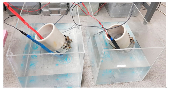 The cylindrical base concrete test specimen was cut into the size specified in both standards (100 mm × 50 mm). Subsequently, the sliced specimen was inserted into the cell designed for each of the standard test procedures. For the ASTM C 1202 test, a 0.3 N NaOH solution was injected into the anode, a 3% NaCl solution was injected into the cathode, and a voltage difference of 60 V (DC ± 30 V) was maintained for 6 h using PERMATM (Giatec Scientific, Ottawa, ON, Canada).
