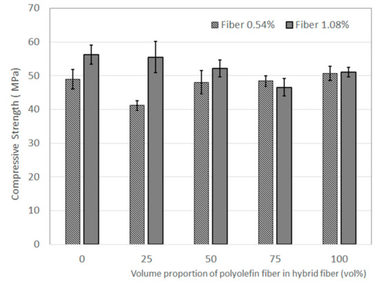 Base concrete with a higher amount of fiber showed a higher compressive strength up to 50% of replacement with polyolefin fiber. When the volume proportion of polyolefin fiber was 75%, the compressive strength did not show any difference as the volume of fiber increased. This indicates that polyolefin fibers contribute much less to the compressive strength than steel fibers. Taking this finding into consideration, in terms of compressive strength, the amount of polyolefin fiber should not exceed 50% for successful hybridization of steel and polyolefin fibers.