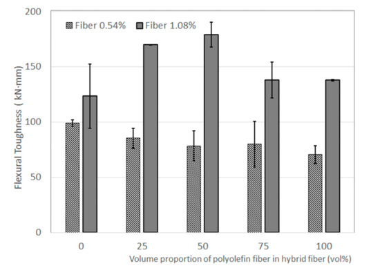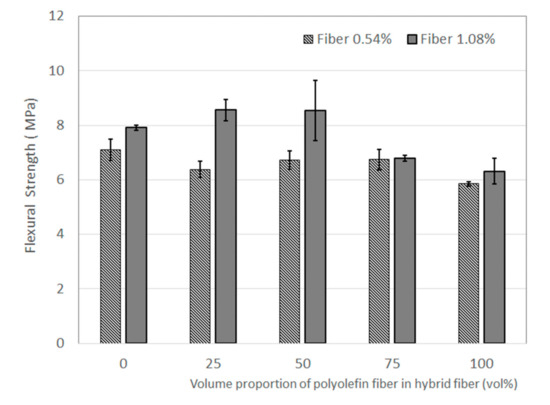 - At a fiber content of 0.54 vol%, the increasing amount of polyolefin fiber generally led to a decrease in flexural strength. However, at a fiber content of 1.08 vol%, an increasing amount of polyolefin fiber up to 50% increased the flexural strength of the base concrete. A synergetic effect was observed for the flexural strength.