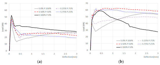 Figure 6 shows the flexural load-deflection curves of the base concrete containing steel and polyolefin fibers at fiber contents of 0.54% and 1.08%, respectively. At a fiber content of 0.54%, a large drop in deflection was observed after maximum peak load. However, in the case of 1.08% fiber content, even when 100% polyolefin fiber was used, there was a recovery of the load after the first decrease in the load, which indicated considerable toughness could be secured by addition of fiber.