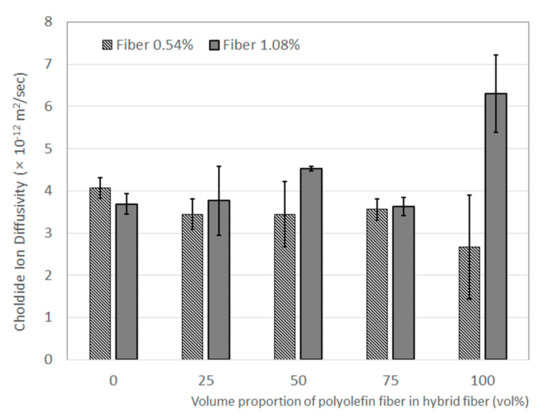 Figure 8 shows the chloride ion diffusivity of the base concrete with hybrid fibers. When the total fiber amount was 0.54%, the chloride ion diffusivity gradually decreased as the volume proportion of polyolefin fiber increased. On the contrary, in the case of a fiber content at 1.08 vol%, as the volume proportion of polyolefin fiber increased, the chloride ion diffusivity generally increased. The base concrete with 100% polyolefin fiber showed relatively higher chloride ion diffusivity than the other base concrete specimens. This seems to be associated with the agglomeration or arrangement of fibers within the specimen. Overall, the chloride ion diffusion coefficient values ranged from 2.67 to 6.30 × 10−12 m2/s, indicating a significant degree of salt resistance when using the combination.