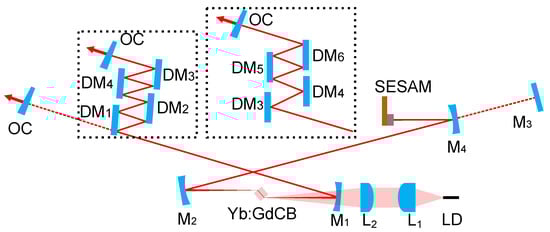 Schematic of the Yb:GdCB laser. LD: fiber-coupled laser diode; L1: aspherical lens; L2: achromatic doublet lens; M1, M2 and M4: concave mirrors; M3: flat rear mirror for CW operation; DM1–DM6: dispersive mirrors; OC: output coupler; SESAM: SEmiconductor Saturable Absorber Mirror.