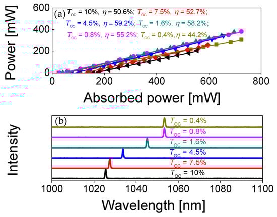 CW laser performance of a-cut Yb:GdCB crystal: (a) input–output dependences for different transmissions of the OC (TOC) and the η—slope efficiency; (b) laser spectra. The laser polarization was E ‖ c.