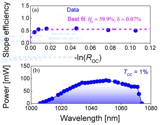 where λp and λl are the pump and laser wavelengths, respectively. The best fit gave round trip cavity losses of δ = 0.07% and an intrinsic slope efficiency of η0 = 59.9% (see Figure 3a). The extremely low cavity losses are evidence for the good quality of the laser crystal and the well-optimized cavity alignment.