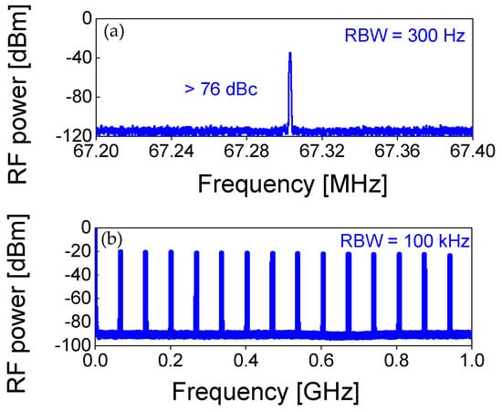 The steady-state pulse train corresponding to the shortest pulses achieved was characterized by a radio-frequency (RF) spectrum analyzer. The first beat note was recorded at ~67.3 MHz with a resolution bandwidth (RBW) of 300 Hz, as shown in Figure 6a. No spurious modulations could be observed with a signal-to-noise ratio above 76 dBc. This, together with the uniform 1-GHz harmonic beat notes shown in Figure 6b, was evidence for the stable CW mode-locking of the Yb:GdCB laser without any Q-switching or multiple pulsing instabilities.