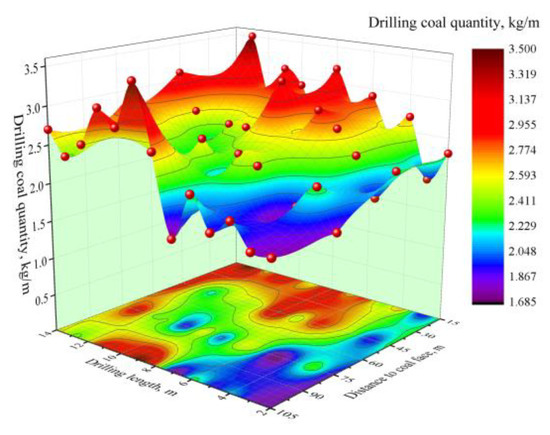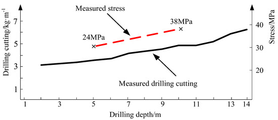 As mentioned above, the amount of cuttings is approximately positively correlated with the confining pressure; it can be regarded as a measure of the equivalent stress. This was verified in Xinglongzhuang Coal Mine, as shown in Figure 3.