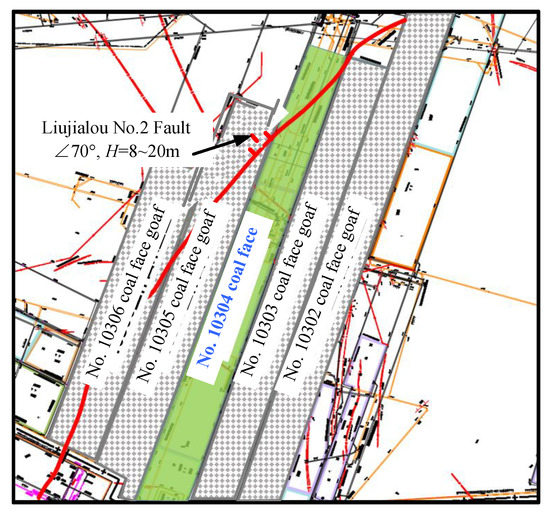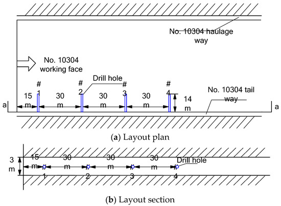 In order to obtain the relationship between roof movement and equivalent stress or drilling cuttings amount, the trial site was selected in the No. 10304 working face of Xinglongzhuang Coal Mine, Shandong Energy Ltd. The trial working face is located in the middle region of the 10th section, as shown in Figure 4.