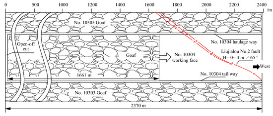 The coal seam numbered as No. 10 is 8.8 m in average thickness. The strike length and the incline length of the coalface are 2370 and 211 m, respectively. The mining depth is 470 m, the uniaxial strength of coal is 19.34 MPa, Young’s Modulus is 38.62 MPa and density is 1.436 × 104 KN/m3. When the trial work began, the coalface had been extracted 1661 m from east to west in orientation. Its north side is adjacent to No. 10303 goaf and south side is adjacent to No. 10305 goaf, as shown in Figure 5.