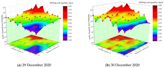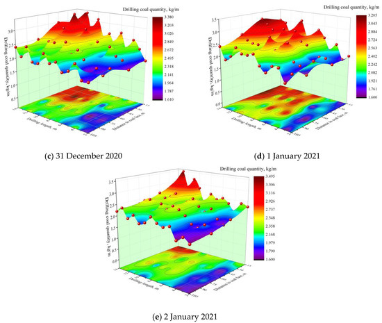 As mentioned above, detections began on 29 December 2020, when the coalface advanced 1661 m, while the roof was in the period of no-weighting. The detecting results showed that the stress concentration zone appeared ahead of the coalface in the range from 9 to 14 m; the cuttings amount was 2.8–3.4 kg/m (Figure 8a). After the coalface advanced 4 m on 30 December 2020, a stress concentration zone indicated by drilling cuttings of 2.6–3.0 kg/m appeared in the range of 10–30 m ahead and 9–13 m laterally; another concentration zone indicated by drilling cuttings 3.0 kg/m appeared in the range of 15–45 m ahead and 13 m laterally (Figure 8b). On 31 December 2020, after the coalface advanced 4 m again, a stress concentration zone indicated by cuttings amount of 2.6–3.0 kg/m appeared in the range of 15–45 m ahead and 9–14 m laterally, and a multi-peak concentration zone appeared at 45 m ahead and 13 m laterally; the maximum cuttings amount was 3.4 kg/m (Figure 8c). On 1 January 2021, after a further 3.75 m coalface advance, a multi-peak stress concentration zone appeared in the range of 15–45 m ahead and 7–14 m laterally; the maximum cuttings amount of 3.2 kg/m appeared (Figure 8d). On 2 January 2021, a multi-peak stress concentration zone appeared in the range of 5–15 m ahead and 10–14 m laterally, the maximum cuttings amount of 3.5 kg/m appeared (Figure 8e), and the lower roof weighting began with a periodic span of 15.75 m.