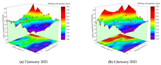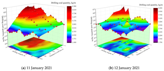 On 3 January 2021, further 3.75 m coalface advanced after the lower roof weighting, a multi-peak stress concentration zone appeared in the range of 5–15 m ahead and 9–14 m laterally, and the maximum cuttings amount of 4.0 kg/m was reached (Figure 9a). On 4 January 2021, multi-peak stress concentration areas appeared in the range of 20–45 m ahead and 8–13 m laterally and in the range of 60–75 m ahead and 11–14 m laterally. The maximum cuttings amount of 4.2 kg/m was reached (Figure 9b), the upper roof weighting compelled lower roof weighting began together with a periodic span of 15.75 m.