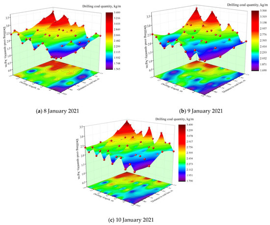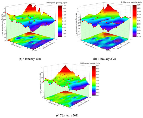 On 5 January 2021, the coalface advanced 3.75 m after stage #1 roof weighting was completed, a multi-peak stress concentration zone appeared in the range of 5–15 m ahead and 6–14 m laterally, and the maximum cuttings amount of 4.1 kg/m was reached; in the range of 30–45 m ahead and 12–13 m laterally, the maximum cuttings amount of 3.2 kg/m was reached (Figure 10a). On 6 January 2021, the coalface advanced 4 m continuously, multi-peak stress concentration areas formed in the range of 5–15 m ahead and 7–14 m laterally and in the range of 50–75 m ahead and 10–13 m laterally. The maximum cuttings amount of 4.5 kg/m was reached (Figure 10b). On 7 January 2021, after the coalface advanced 4 m, a stress concentration zone appeared in the range of 5–15 m ahead and 11–14 m laterally, the maximum cuttings amount of 3.3 kg/m appeared (Figure 10c), and the lower roof weighting began with a periodic span of 11.75 m.
