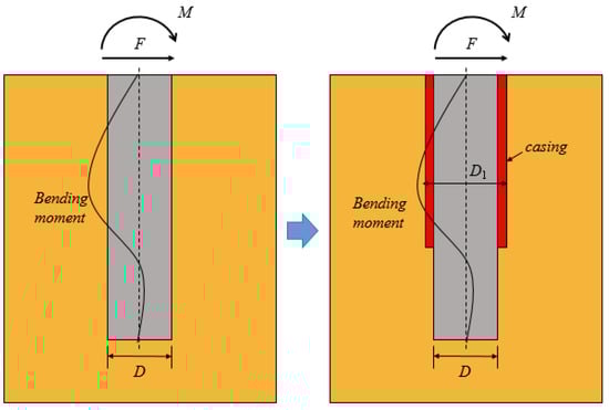 Cast in situ concrete piles (CCPs) have been widely used in bridge projects to bear complex and large loads, especially the lateral load and overturning moment. During the cast in situ concrete pile construction process, steel casings are widely used. However, in some projects, these tubes cannot be removed before grouting. This will form a drilled shaft with partial casing (DSPC). Fortunately, it was found that these piles are more supportable than traditional CCPs. For example, in the Tai Zhou Bay Super Bridge of China, the lateral force from the upper bridge was so large that it caused a large bending moment in the pile foundation, of which the section strength could not bear; a similar phenomenon has been observed in the Hong Kong–Zhuhai–Macao Bridge. Some research has also been conducted on similar improvements for concrete-filled steel columns [1] and concrete plugs embedded in tubular steel piles [2,3].