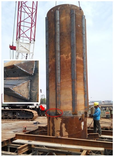 DSPCs have some differences from traditional CCPs, concrete-filled steel columns, or concrete plugs embedded in tubular steel piles [2,4,5]. In a DSPC, the steel casing is partially used (Figure 1); then, a hole is drilled in the casing, and the soil in the tube is removed by the slurry method. This may result in a weak bond between the concrete body and steel tube in the composite structure. Many results have been reported about the bond stress capacity of concrete-filled steel columns. In these studies, the different shapes of column sections were tested [6,7], and the interface length, interface condition [8], mechanical connectors, and diameter-to-thickness (D/t) ratio were also studied [9,10,11,12]. However, few of them have investigated the assumed plane cross-section effect on the bending capacity of DSPCs, the mud effect on the bond strength, and the mechanical interlocking of concrete–steel interfaces under bending conditions.