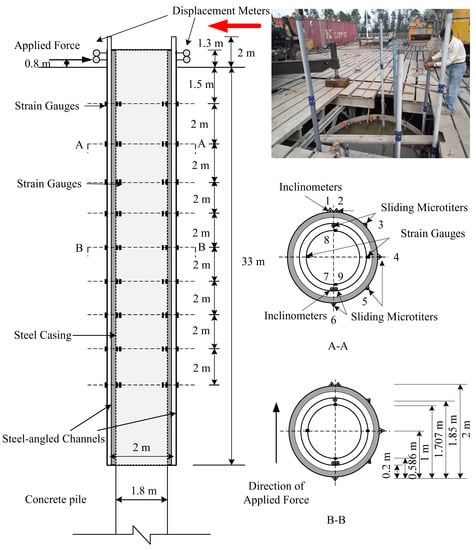 A cast in situ reinforced concrete pile with a partial steel casing was load tested at a bridge construction site located in the coastal area of Zhejiang, China. The cast in situ pile had a designed diameter of 1.8 m and an embedment length of 87.9 m. In the pile body, reinforcement bars with a nominal yield strength of 300 MPa and an ultimate tensile strength of 350 MPa were used. The casing had an outer diameter of 2 m, a thickness of 0.075 m, and an embedment depth of 33 m (Figure 2). The casing had a nominal yield strength of 300 MPa and an ultimate tensile strength of 350 MPa. Therefore, the test pile had an outer diameter of 2.0 m at depths from 0 m to −33.0 m and an inner diameter of 1.8 m from −33.0 m to −87.9 m.