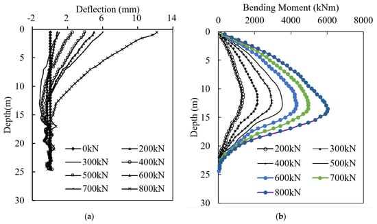 (a) Deflection vs. depth and (b) bending moment vs. depth.