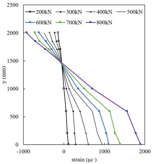 The purpose of the field test is to evaluate the pile section with the maximum bending moment and to verify the plane cross-section assumption. From the deflection profiles in Figure 4a, we can see that the data from inclinometers and those from sliding micrometers agreed with each other, which means that the casing and the concrete body of the pile bent as an assembly. The bending moment along the pile and the casing is shown in Figure 4b. From the bending moment profile curves, we can be assured that the maximum bending moment existed in the casing-covered pile section at depths from 11 to 14 m. The larger the applied force was, the deeper the maximum bending moment appeared. It should be noted that the value may not be the real bending moment, and we merely care about the position where the maximum bending moment appeared. Therefore, as seen from Figure 2, the depth of 12 m where the strain gauges were attached was the nearest measurement section in the pile body. The distribution of strain along the cross section is given in Figure 5.