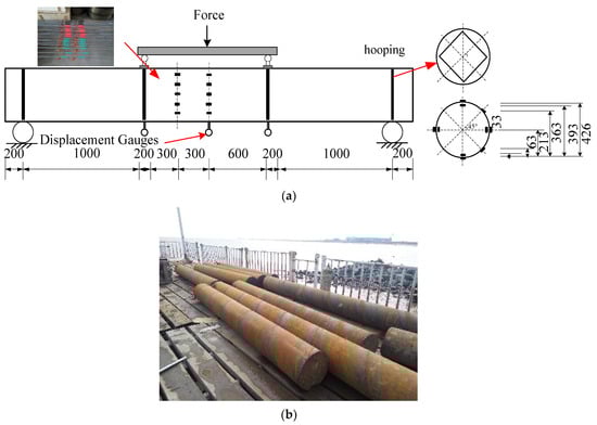 Similarly, the reinforcing cages used in these specimens were the same. Each of them consisted of four longitudinal bars (16 mm diameter with nominal yield strength of 400 MPa) and hooping (10 mm diameter with nominal yield strength of 300 MPa). As shown in Figure 7a, the side length of hooping was 255 mm. Hooping was installed at four sections of each specimen, which were 0.2 m, 1.2 m, 2.8 m, and 3.8 m in length. Because of the construction conditions, the shape of the hoop was rectangular, which was not like the test pile used in the field test. While we focused on the interface effect of concrete and steel casing on the bending capacity of specimens, the effect of hooping shape had a limited effect on this.