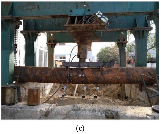 A vertical load was applied through a jack (shown in Figure 7c), which introduced a pure bending moment situation at the middle of the beam. Identical loads were applied at two points on the beam. As shown in Figure 7a, a concrete pool with a size of 4 m × 5 m × 4 m was used as the loading table, and the specimens were 4 m long and hinged on it, which can restrict displacements of the ends. The distance between the two hinges was 3.6 m. Three dial gauges were installed at the opposite side of the loading point and at the middle of the span. The accumulation of the initial load was 10% of the ultimate load of specimens for each loading step and was kept for 2 min. When it was close to the failure state, the specimens were loaded slowly until failure.