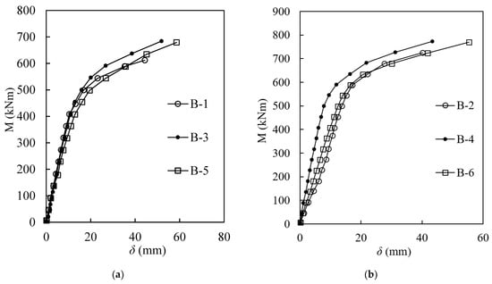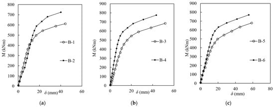 From the results mentioned above, flexural failure was observed from those tests. Figure 9a shows comparisons of the bending moment-deflection curves of the beams with different mud conditions for two types of casing thicknesses. The bending moment at the central of the beam, M, is from the theory of a simply supported beam under concentrated loads. Groups B1, B3, and B5 were designed with the same materials and geometry (the casing thickness was 5 mm), and the difference was the mud condition. B1 had no mud between the concrete and casing during construction, whereas B2 had worse bond quality and B3 had worse bond quality than B2. Groups B2, B4, and B6 were also designed with the same method (the casing thickness was 10 mm), and the difference was also the slurry condition.