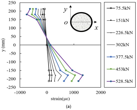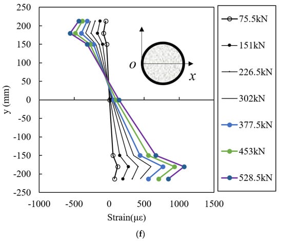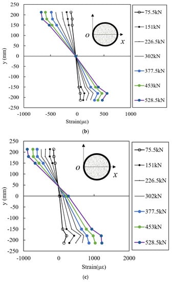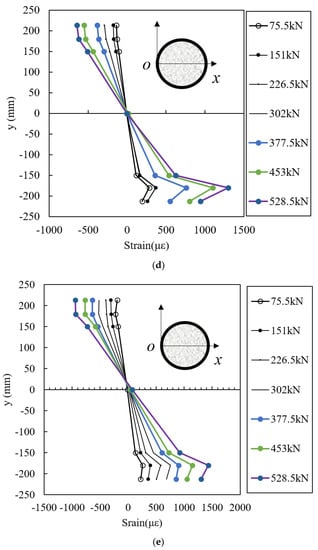 Strain gauges at the surface of the casing and in the concrete were used to measure the strain of the specimens. The changes in strain along the pile section of different specimens are shown in Figure 11. The strain along the height of the pile section of specimen B1 at different loading steps is presented in Figure 11a. The axis line of the pile was at the height of 213 mm. It is obvious that the strain above the neutral plane was negative, which indicates the pressure area of the specimens; furthermore, the strain below the neutral plane was positive, which presents the tensile area of the specimen section. The strain of the casing and concrete is linearly distributed at the initial loading stage, which means that the casing and the concrete body of the pile deformed as an assembly; thus, the plane cross-section assumption was reasonable at this stage. However, with increasing loading, the nonlinear layout became more obvious, which means that the plane cross-section assumption was no longer suitable. A similar conclusion can also be found in Figure 11b.
