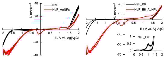 In terms of electrochemical properties, the potential range from 1.5 to 2.0 V is very important because, in addition to oxygen depolarization, there is also the continuous change of the electrode/electrolyte interface. In this range of potential, gold nanoparticles oxidize (NaF_AuNP curve). The properties of gold nanoparticles are highlighted so that the anodic current densities are considerably reduced in their presence, decreasing from 37 (NaF curve) to 22 mA × cm−2 (NaF_AuNP curve). According to the cyclic voltammogram NaF_B6, lower values of anodic current densities are recorded, compared to that of the supporting electrolyte. This is due to the strong adsorption processes of organic vitamin molecules on the surface of the gold electrode. The electrochemical analysis highlights the heterogeneous oxidation processes corresponding to the oxidation of organic molecules by the appearance of an anodic peak, well defined by low intensity at anodic potential of 0.9 V. In the detail of the NaF_B6 curve, shown in Figure 2, there is a clear increase in current densities starting with potential greater than 0.8 V. This is also the onset potential corresponding to the charge transfer in which the pyridoxine molecules are involved. The simultaneous presence in the electrolyte solution of pyridoxine and nanoparticles (NaF_B6_AuNP curve) has an antagonistic effect, thus reducing the anodic current densities corresponding to oxygen depolarization (NaF curve), but at the same time has higher current densities compared to the NaF_AuNP curve. The characteristics and appearance of cyclic voltammograms also changes during cathodic polarization. The cathodic polarization highlights the appearance of a peak of the cathodic current density in the support electrolyte, with low intensity (0.7 mA × cm−2), due to the reduction of oxides/hydroxides on the surface of the gold electrode. Characteristic to this peak is that, in the presence of gold nanoparticles, the peak intensity increases to 7.5 mA × cm−2, and in the ternary system (NaF_B6_AuNPs) it has the highest value of 12.6 mA × cm−2.