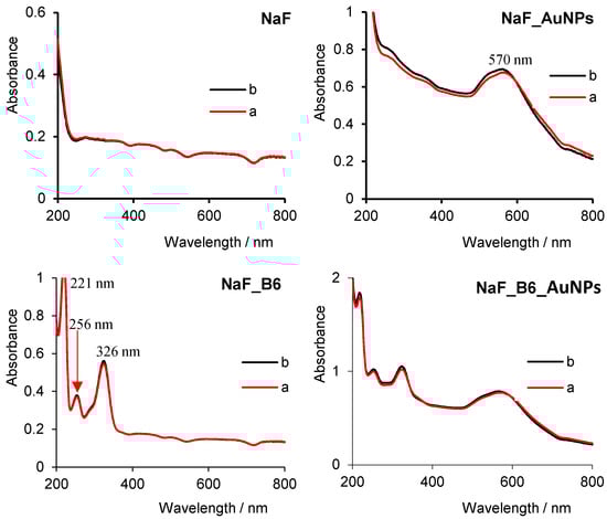 UV–Vis absorption spectra of electrolyte solution containing NaF/B6/AuNP systems; b—before and a—after performing cyclic voltammetry.