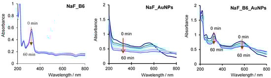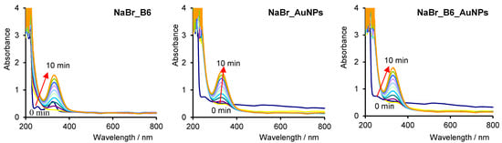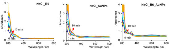The electrolyte solutions NaCl_B6, NaCl_AuNPs and NaCl_B6_AuNPs were subjected to electrolysis at constant current density in association with UV–Vis spectrophotometric analysis. The UV–Vis spectra recorded every minute, over a period of 10 min, are shown in Figure 7.