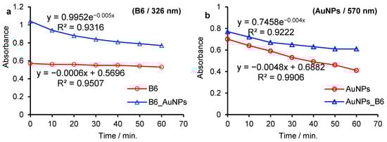 According to Figure 4a and Table 1, it is observed that the rate of electrochemical degradation of pyridoxine is higher in the presence of gold nanoparticles (there is a 7-fold increase). At the same time, a change in the initial absorbance value is highlighted, which proves a spontaneous chemical interaction between the pyridoxine molecules and the gold nanoparticles. Another important feature is that, in the presence of gold nanoparticles, it fits a first-order reaction model, which means that the rate is proportional to the concentration of a single reactant [57].