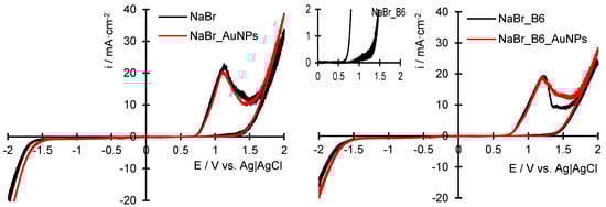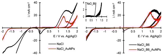 Cyclic voltammetry responses of gold electrode in binary electrolyte solutions, NaCl_B6, NaCl_AuNPs and ternary NaCl_B6_AuNPs are shown in comparison to those of the individual support electrolyte (NaCl) in Figure 5.