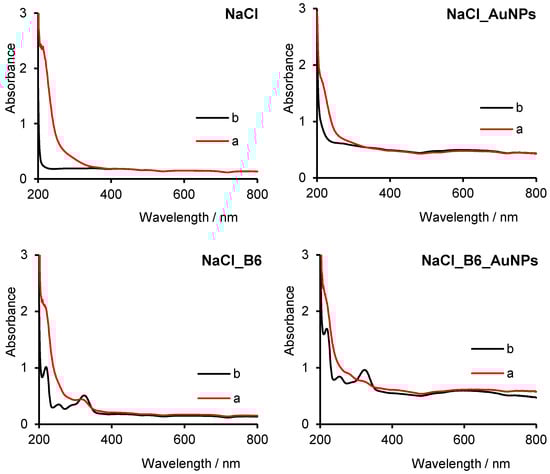 UV–Vis absorption spectra of electrolyte solution containing NaCl/B6/AuNP systems; b—before and a—after performing cyclic voltammetry.
