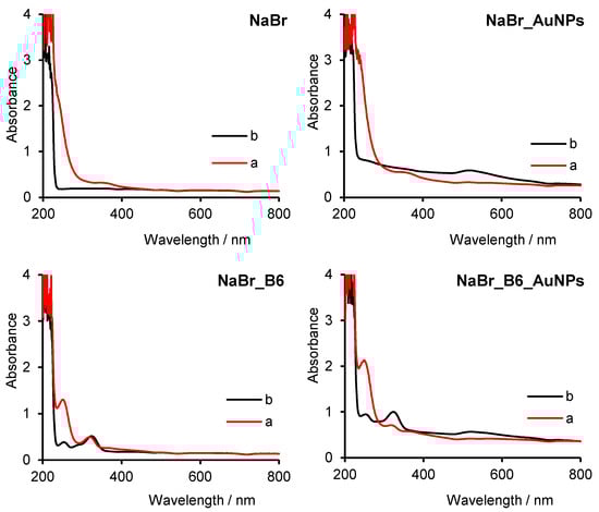 UV–Vis absorption spectra of electrolyte solution containing NaBr/B6/AuNP systems; b—before and a—after performing cyclic voltammetry.