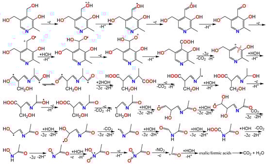 This mechanism applies to experimental observations obtained in the presence of an inert support electrolyte, such as a fluoride ion. At the same time, the mechanism ensures the electrochemical degradation of pyridoxine to obtain inorganic final products such as nitrogen dioxide, carbon dioxide and water.