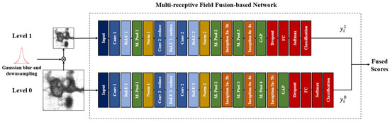 As it is difficult to collect sufficient defect samples for the deep network, the main challenge in this study is to extract more significant features from limited data. Concretely, two pre-trained GoogLeNets are adopted as the backbone architecture of the MRFFN. Here, the input size of the level 0 model is modified to 200 × 200, which contains the exact same resolution as the input images. Thereafter, the Gaussian pyramid downsamples the original images into a spatial resolution of 100 × 100 pixels, providing less information for the training model. This, however, appears to be inadequate for the deep structure like GoogLeNet to tackle the lower resolution images. Thus, the input size of the level 1 model is set to 100 × 100 pixels to prevent the risk of an overfitting phenomenon. Besides, the last two inception modules (i.e., inception module 5a and inception module 5b) of the pre-trained GoogLeNet have been discarded to scale down the computational load of the level 1 model. The overall framework of the proposed method is shown in Figure 3.