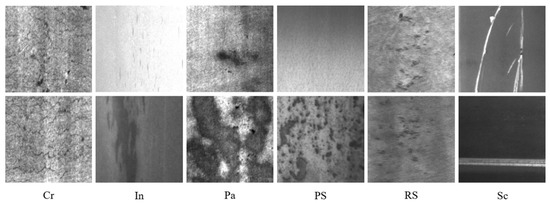 In this study, a typical steel surface defect dataset, namely Northeastern University (NEU) dataset [1], was utilized to evaluate the performance of the proposed method. The NEU dataset consists of six typical surface defects, viz., crazing (Cr), inclusion (In), patches, (Pa), pitted surface (PS), rolled-in scale (RS), and scratches (Sc). In total, the NEU dataset contains 1800 grayscale images with a spatial resolution of 200 × 200 pixels, and approximately 300 defect images were collected in each class. The examples of the NEU dataset are shown in Figure 4. From these examples, it can be seen that the complex variance of the surface defects and the influence of the illumination are challenging issues for describing the dataset.