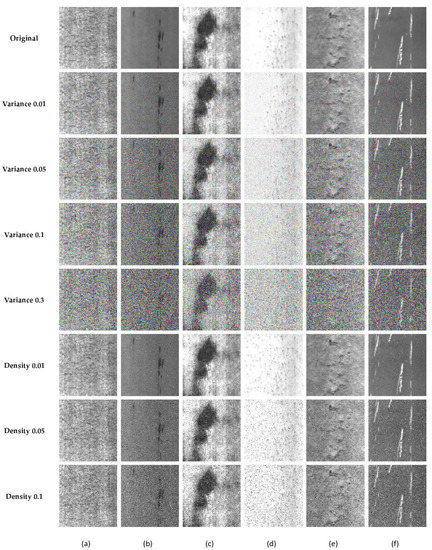 Furthermore, the disturbance defect dataset is constructed herein to evaluate the robustness of the MRFFN. The interference defect dataset involves two common noises in the actual production environment, which are Gaussian white noise and salt and pepper noise. According to Luo et al. [46], due to the high temperature of the image sensor or the lack of illuminance, the occurrence of Gaussian noise will occur during data collection. Besides, the transmission error by the camera will generate random black or white points (salt and pepper noise) and disturb the feature learning progress. Moreover, the high speed of the production line should be considered as it may cause a motion blur effect while capturing images. Hence, this study provides three common interference situations in the image acquisition process, including Gaussian white noise, salt and pepper noise, and motion blur. First, the variance of the zero-mean Gaussian white noise is set as 0.01, 0.05, 0.1, and 0.5 accordingly. Second, the density of salt and pepper noise is set as 0.01, 0.05, 0.1, and 0.5. Lastly, the length of the motion is set as 5, 10, 15, and 20 with a stochastic angle between 0° and 360°, as shown in Figure 5. For the interference defect dataset, 50 samples for each type of defect are randomly picked as the training samples and the remaining samples are regarded as the testing samples.