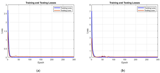 Figure 6 shows the training and testing losses of the level 0 and level 1 models. It can be seen that both networks have a high convergence speed in the first 100 epochs. While comparing the training progress between the level 0 and level 1 models, the testing loss of the level 0 model is much closer to the training loss. This result indicates that the level 1 model contains a higher risk of the overfitting phenomenon owing to less information being provided for the training model. Lastly, the testing loss gradually stabilized after training for 100 epochs, and the experimental results indicate that the testing loss almost remained the same during 200 to 300 epochs. Hence, this result suggests that 300 epochs are suitable for training the models.
