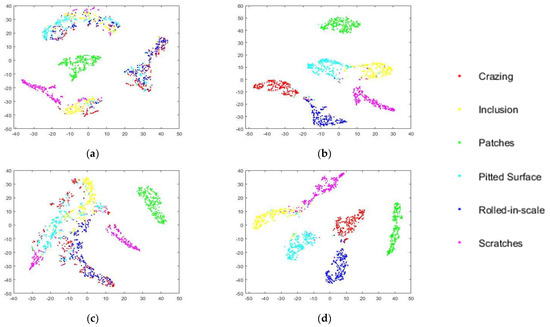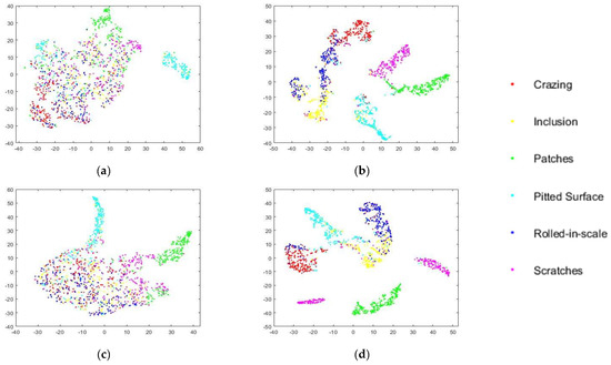 In addition, to visualize the classification performance on the disturbance defect dataset, a nonlinear dimensionality reduction technique, namely t-distributed stochastic neighbor embedding (t-SNE), was adopted to visualize the classification performance on the disturbance defect dataset. Concretely, t-SNE reduced the data dimensionality so that it was easier to interpret and analyze. Besides, the proposed MRFFN adopted multiple inception modules to extract multiscale features and applied the max pooling layer to downsample the aggregate features. Lastly, a fully connected layer was applied to extract all of the discriminative information from the above layers. Hence, the activations of the fully connected layer from both the level 0 and level 1 networks were applied as the feature vectors of the feature visualization to provide a better interpretation of the activations for the decision of interest. Figure 7 and Figure 8 demonstrate the data distribution of the proposed MRFFN on Gaussian white noise and salt and pepper noise datasets. According to the t-SNE maps, it is observed that the original MRFFN could roughly differentiate the majority classes of pitted surface and patches defects. However, the majority classes of crazing, inclusion, rolled-in scale, and scratches were thoroughly mixed with each other. Thus, it can be clearly explained why the original MRFFN yielded the worst performance on the disturbance defect dataset. On the other hand, when the disturbance defect dataset retrained the proposed MRFFN, six clusters could be found clearly in Figure 7, Figure 8 and Figure 9. Therefore, these results indicate that MRFFN shows its robustness when the models are retrained by the disturbance defect dataset.