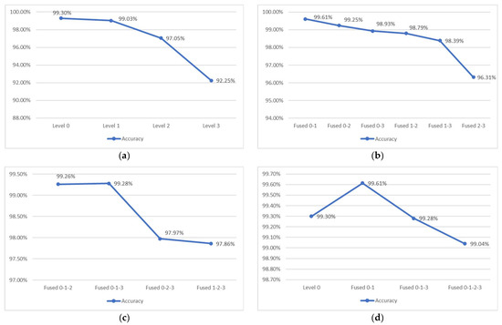 In the proposed method, the Gaussian pyramid can provide a multi-level of sub-images. However, the high-level images are obtained through several low pass filtering and downsampling processes, which implies that the higher level contains more information loss. To investigate whether the model could extract important features from the higher level, this section will discuss the performance of each model and fusion network. Here, the level 1 structure was adopted as the level 2 and level 3 structures, which removed the last two inception modules from the pre-trained GoogLeNet and applied a higher learning rate factor for the shallower layers. According to Figure 10a, the accuracies of the individual networks decreased as higher levels of the Gaussian pyramid were applied, the accuracy gaps between level 1, level 2, and level 3 increased significantly, which indicates that some important features were removed in the high level of the Gaussian pyramid. While comparing the performance between individual networks and fused two networks, the fused 0–1 network achieved the highest accuracy (99.61%) among the fused two networks based on the results in Figure 10b. In contrast, the fused 0–2 and fused 0–3 networks were 0.05% and 0.37% lower than the level 0 network, and the fused 1–2 and fused 1–3 networks were 0.24% and 0.64% lower that the level 1 network. In Figure 10c, the overall performance of the fused three networks was lower than the level 0 network, and the accuracies dropped significantly while applying level 2 and level 3 as the main proportions. These results indicate that the level 2 and level 3 networks were misleading the prediction of the fusion network. Lastly, the greatest performances of the individual network, fused two networks, fused three networks, and fused all networks are compared in Figure 10d. It shows a noticeable peak at the fused 0–1 network, which illustrates that the fused 0–1 yielded the highest accuracy among all of the networks. Besides, the results of the fused three networks, which contained larger training parameters, were not as good as the fused 0–1 network. These results indicate that the fused 0–1 network is able to promote the performance of the individual network, simultaneously surpassing the other large-scale fusion network. As a result, this study utilized level 0 and level 1 of the Gaussian pyramid as the proposed method.