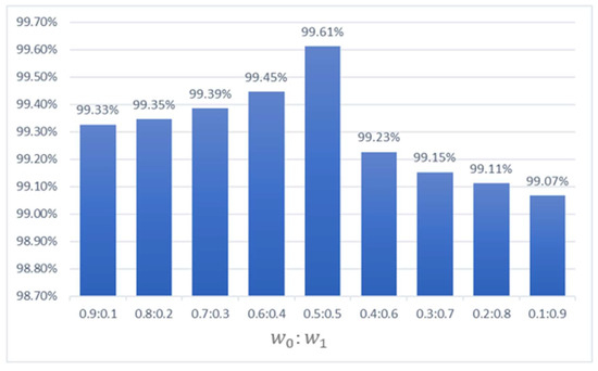 In Section 3.3, the equation of the final prediction result is introduced and both networks had an average weight while calculating the final scores. This section will discuss the performance of fusion networks under different weight circumstances. Here, the weight of the arbitrary network decreased from 0.9 to 0.1 while the other weight increased from 0.1 to 0.9, respectively. In this experiment, all the implementation details were taken according to Section 3.1 and by applying 50 samples from the NEU dataset as the training set. Based on the experiment results, the level 1 models were able to enhance the performance of the level 0 models. According to the report in Section 3.3, the level 0 models had an average accuracy of 99.30%. Hence, the accuracy of the fusion networks was improved when comparing the results below with the level 0 models. Obviously, once the weight of the level 0 models was greater than or equal to the level 1 models, the overall results of the fusion networks was higher than the level 0 models. In Figure 11, it can be seen that the accuracy of the fusion network was increasing when the weight of the level 0 models decreased. The results show that the fusion network had the highest accuracy of 99.61% when applying an average weight for both networks. However, once the level 1 models had a greater influence than the level 0 models, the performance of the fusion networks decreased gradually. Thus, these results indicated that the average weight was the most conducive for improving the performance of both networks. Lastly, in order to solve the divergent results between the fusion networks, the weights of the level 0 and level 1 models were set as 0.6:0.4 when the final results contained the two highest scores, as it achieved the second-highest accuracy among the other weights.