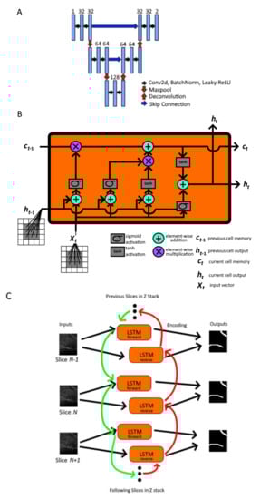 The LSTM-UNet is our proposed 3D-2D deep learning framework that uses bidirectional convolutional LSTM networks to incorporate the 3D context (i.e., inter-slice connectivity) from 3D input slices with unfixed depths to output 2D segmentation maps. LSTM networks are a form of RNNs that extend base RNN’s ability to model sequential data by updating a hidden state representation with input-to-state and state-to-state operations, namely an input gate, output gate, forget gate, and cell-state, which can better account for long-term sequential data []. Importantly, a LSTM model allows for varying numbers of input slices, which is necessary for our task, as the volumes containing each vessel plexus can vary in size when considering retinal layer thickness variability across patient populations [,]. While the standard LSTM classically uses fully connected layers for language processing applications, for our purposes, we employed a convolutional LSTM, which uses convolutional structures in the input-to-state and state-to-state transitions to more efficiently handle sequential spatial data (Figure 1B) []. Furthermore, to incorporate the inter-slice context from both the previous and following slices, we presented slices to two distinct LSTM units in forward (top-to-bottom) and reverse (bottom-to-top) order and concatenated the outputs to generate a bidirectional convolutional LSTM (Figure 1C) []. In our LSTM-UNet architecture, we used bidirectional LSTM units at three input resolutions during image encoding (Figure 3). The encoded outputs were concatenated with up-sampled images during decoding, eventually resulting in a single channel 2D output that could be fed into a UNet unit.