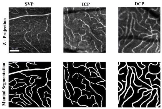 Sample Z-projection image and manual segmentation for each plexus (superficial vascular plexus (SVP), intermediate capillary plexus (ICP), deep capillary plexus (DCP)).