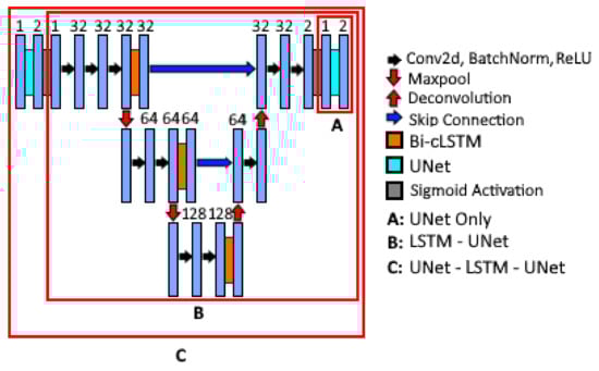 Schematic outlining the nested architectures compared in the study: (A) UNet Only, (B) Long Short-Term Memory (LSTM)-UNet, and (C) UNet-LSTM-UNet (two-dimensional convolutional operation (Conv2d), batch normalization (BatchNorm), rectified linear activation function (ReLU), bidirectional convolutional long short-term memory network (Bi-cLSTM)).