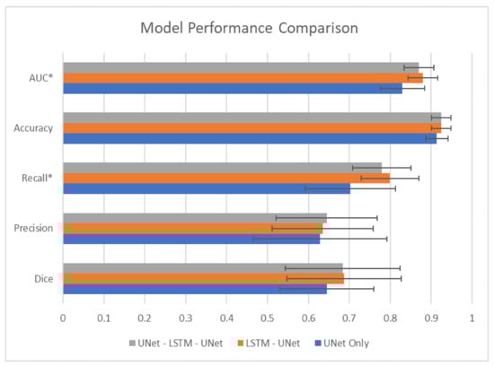 Performance metrics (unitless) on testing set for the three segmentation architectures (AUC = area under receiver operating characteristic curve). Error bars indicate standard deviation. * indicates significant difference (p-value < 0.05 by one-way analysis of variance).