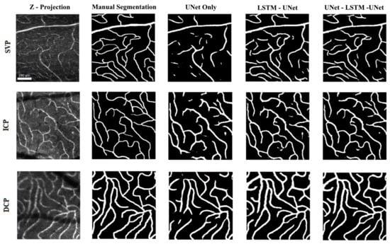 Previous studies have examined alternative 3D-2D vessel segmentation approaches in OCTA retinal imaging and other imaging modalities. Li et al., have developed a novel image projection network (IPN) which uses a unidirectional pooling layer to effectively learn weights for each slice within the projection step []. This unidirectional pooling layer in the IPN necessitates consistent pixel volumes as input, which would require interpolation or compression of non-uniform input for individual retinal layer blood vessel segmentation. In a large dataset of 500 OCTA volumes, their most recent iteration has shown a best Dice coefficient of 0.93 representing a 0.03 improvement over the baseline 2D-2D UNet with a Dice coefficient of 0.90 in their dataset []. As an imaging modality, OCTA uses motion-based processing to improve vessel contras [] and it is expected that the segmentation performance on OCTA data would be greater in both the base UNet and the IPN than in AO-OCT volumes, which in its current form, does not perform any additional processing to improve vessel contrast. In comparison to the added benefit demonstrated by the 3D-2D architecture of Li et al. over baseline UNet, we achieve similar improvement of 0.04 with a Dice coefficient of 0.69 with our LSTM-UNet relative to 0.65 in the UNet alone. Lee et al. developed a Spider U-Net, which similarly uses bidirectional convolutional LSTM to capture inter-slice connectivity, but employs the LSTM in between the encoding and decoding path of several UNet modules for each slice []. This architecture was trained and evaluated on multiple modalities, specifically Brain MRA, Abdomen CT and Cardiac MRI, for 3D-3D segmentation of blood vessels with Dice coefficients for Spider U-Net improving over 2D UNet by 0.05, 0.13, and 0.06, respectively for each dataset. While this architecture differs from ours in that it requires annotations for each slice within a 3D volume for training and was evaluated on (non-retinal) vessel and organ segmentation tasks, Lee et al., found that incorporating a LSTM for inter-slice connectivity for their task produced fewer false-negative pixels. Our results are consistent with this finding as the recall for our LSTM-based models were significantly improved over the UNet based models alone.