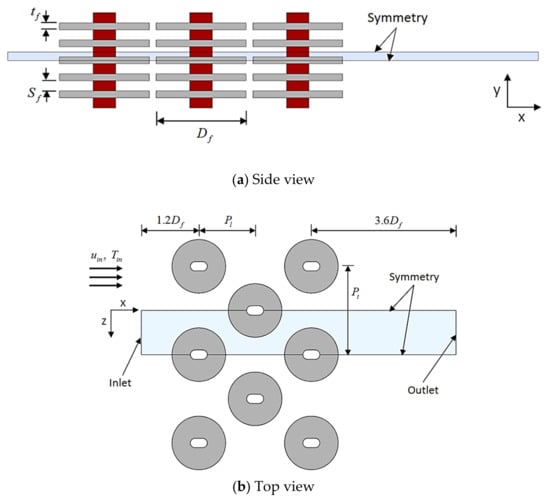 Recently, Unger et al. [] numerically investigated the impact of tube bundle arrangement, flat-tube dimensions, transverse, and longitudinal tube pitches on natural convection thermal exchange. They observed that the circular tube and flat-shaped tube with an axis ratio of 1:2.1 were the most efficient configurations. Darbari and Alavi [] applied the Taguchi method to explore the impact of flat tube configurations (without fins). Alnakeeb et al. [] conducted numerical simulations to investigate the thermal and hydraulic details of a plain plate-fin with varying inlet air velocity and flat-tube aspect ratio . The simulation results indicate that reducing the aspect ratio of the flat tube from 1 to 0.33 lowered the pressure loss by 33.7% (at ) and 57.3% (at ). On the other hand, the thermal exchange increased by 52.9% (at ) and 111.5% (at ).