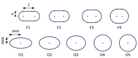 Schematic of different flat and oval tube geometries (RMN = minor axis radius, RMX = major axis radius).