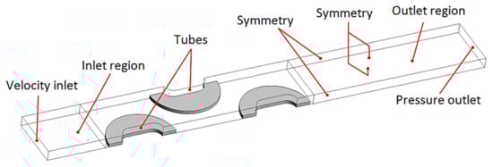 The actual numerical problem is solved as conjugated conduction–convection thermal exchange, and the conduction through the annular fins is analyzed. The details concerning the boundary conditions, shown in Figure 3, are given in Table 2.