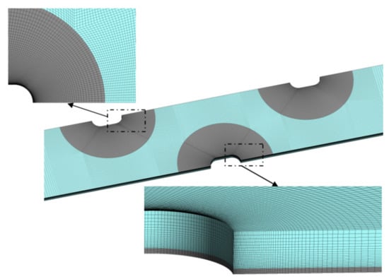 In this numerical investigation, the commercial software ANSYS FLUENT 18.2 was utilized. As shown in Figure 4, the mesh layers are refined in regions where the gradients of velocity and temperature are high, such as surrounding the flat and oval tubes, as well as annular-fin surfaces. The choice of the first grid corresponds to the requirement of the y+ parameter of the renormalization group of the k-ε turbulence model (y+ ≤ 5.0).