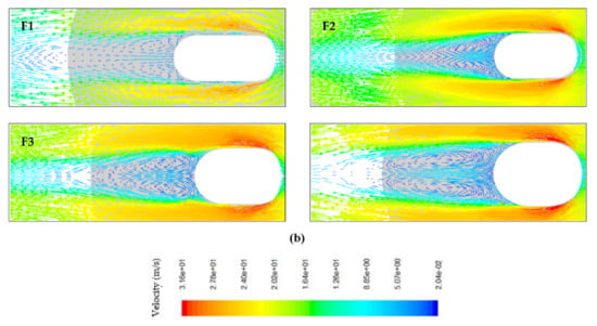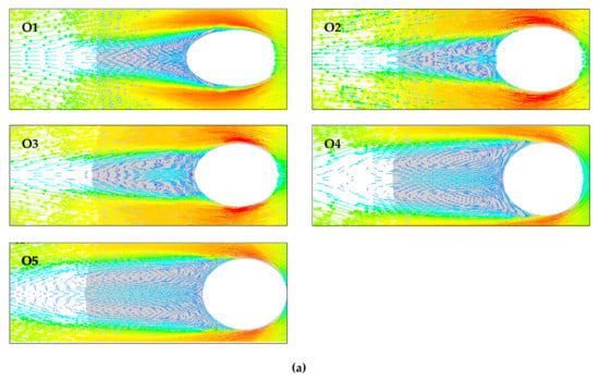 Finding the tube geometry that reduces the inactive heat transfer region (recirculation zone) and improves the heat transfer intensity is very important []. The velocity vectors near the fins and behind the tubes of the second rows for both oval and flat tube configurations are illustrated, respectively, in Figure 5a,b, at the maximum inlet velocity. For all tube designs, the recirculating vortices may be seen starting from the flow separation point, moving alongside the mean flow, and then returning to touch the rear wall of the tube (dotted circles). However, the size of this recirculation clearly decreases with the increase of ellipticity and flatness of tubes where the size of the wake region shrinks for O1 and F1 tube shapes. For all cases, the maximum fluid velocity is always found at the narrowest cross-section flow passage between two adjacent tubes; because of this, the right and left sides of the fin surface are characterized by higher heat transfer than the other regions.