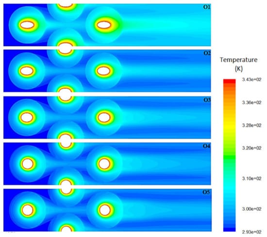 Temperature contours in the middle of the fin thickness for all the geometries of the oval tube.